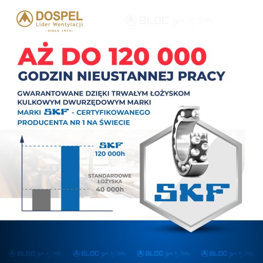 - Bardzo cicha praca – to ogromny atut tego produktu. Zapewniają ją zastosowane łożyska SKF. To trwałe łożyska kulkowe dwurzędowe, wyprodukowane przez producenta nr. 1 na świecie