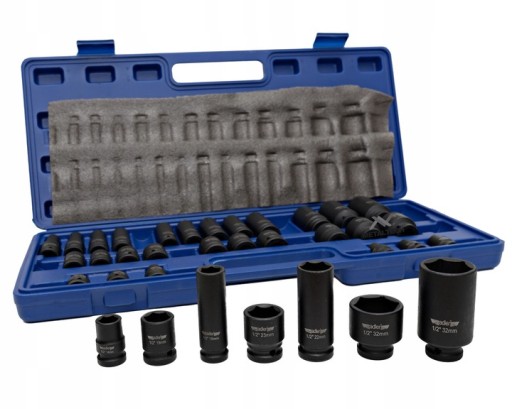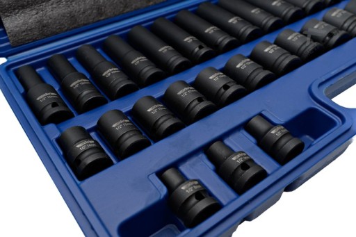 Zestaw nasadek udarowych 1/2 sześciokątnych długich, składa się z 35 elementów. Zawiera sześciokątne nasadki udarowe w popularnych rozmiarach od 8 do 32 mm.