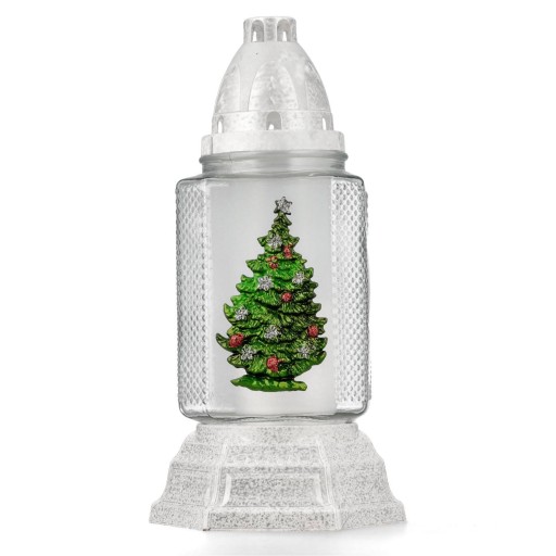 Klasyczny znicz z przezroczystego szkła, na przodzie znajduje się piękna choinka. Podstawka i komin są z plastiku w kolorze biało srebrnym.