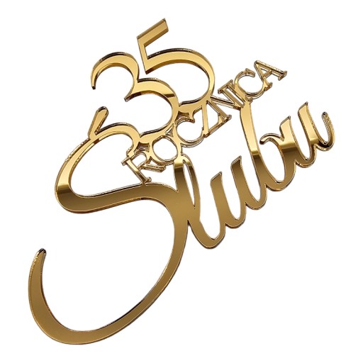 Ten elegancki dekor został wykonany z wysokiej jakości złotej lustrzanej plexi, co nadaje mu wyjątkowy blask i prestiżowy charakter. Złocista powierzchnia doskonale współgra z różnymi stylami tortów, dodając im luksusowy akcent. Zastosowana czcionka została starannie dobrana, by podkreślić uroczystość jubileuszu, nadając mu jednocześnie subtelną finezję.