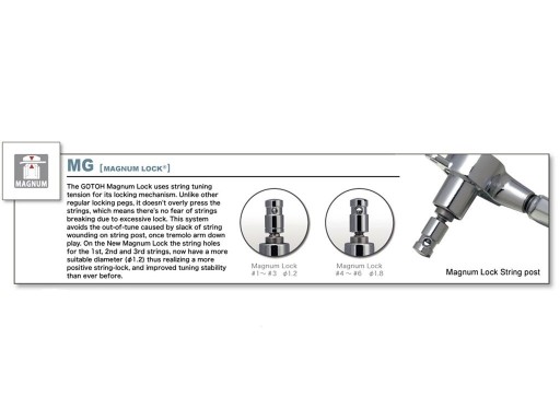 MG to klucze z blokadą automatyczną Magnum-Lock. Wystarczy przeciągnąć do samego końca strunę przez otwór w kluczu i kręcić pokrętłem. Pierwsze obroty nie spowodują nawijania struny, tylko jej zblokowaniewewnętrznym bolcem w trzpzieniu. Nie nawijamy struny więcej niż 3/4 zwoju. Przed strojeniem wskazane jest lekkie naciąganie struny aby ułożyła się właściwie w kluczu.
