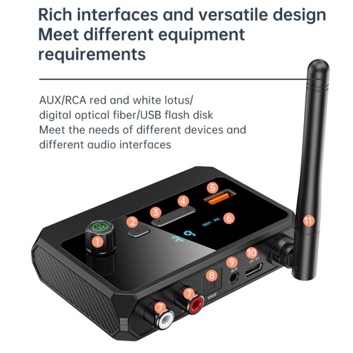 [Odbiornik audio i] Adapter audio z bogatymi interfejsami, takimi jak 3,5 mm AUX, RCA prawy i lewy, światłowód, obsługa odtwarzania odczytu, plug and play, nie wymaga sterownika, wszechstronna konstrukcja spełniająca potrzeby różnych urządzeń