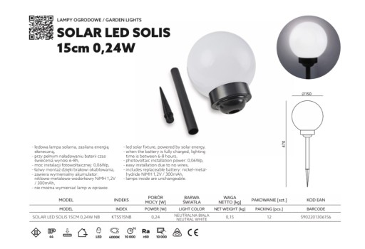 - Kula solarna posiada zintegrowane źródło światła, które świeci neutralnym białym światłem (4000K).