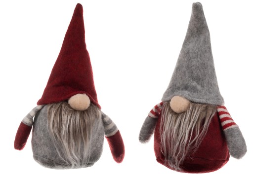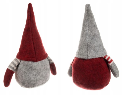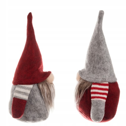 Pierwszy skrzat ma czerwoną czapkę i szary brzuszek, drugi skrzat ma odwrotne kolory. Co dodaje fantazyjności dekoracji.