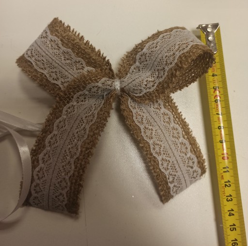 Dokładne wymiary podane na zdjęciach. Długość tasiemki do przywiązania kokardy to około 70 cm.