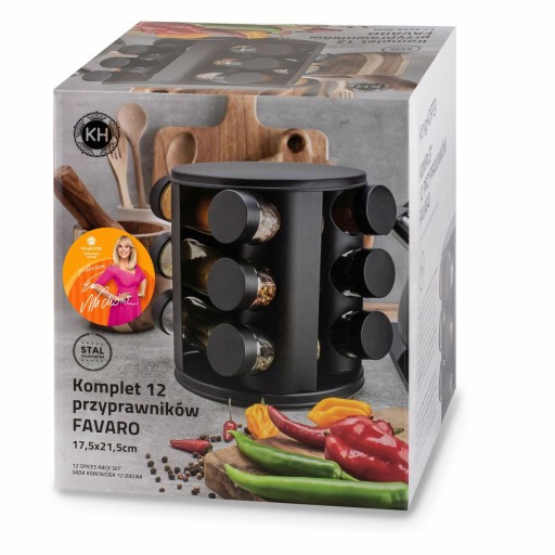 Komplet przyprawników Konighoffer Favaro 12 elementów łączy w sobie elegancję, trwałość i funkcjonalność. Szklane pojemniczki mają tu metalowe zakrętki i nakładki z tworzywa sztucznego z otworami pozwalającymi na sprawne i dokładne doprawianie jedzenia. Obrotowy stojak jest nierdzewny i malowany proszkowo na czarno. Sposób umieszczenia słoiczków tworzących przyprawnik Favaro 17,5 x 21,5 cm zapobiega ich wysunięciu w trakcie użytkowania lub przenoszenia produktu. Możesz ustawić go w zasięgu ręki. Pomoże ci zorganizować przechowywanie najczęściej używanych przypraw, jak mielona papryka, czosnek granulowany, bazylia, oregano oraz cynamon. Zatrzymasz też na dłużej aromat i smak zawartości każdego z 12 przyprawników kuchennych ustawionych na tym metalowym stojaku obrotowym. Sprawdzi się na co dzień, podczas sezonowego grilla, a nawet gdy w trakcie tworzenia sosów do pizzy, czy lekkich sałatek na romantyczną kolację. Masz też możliwość łatwego oznaczenia, co znajduje się w słoiczkach – zakrętki umożliwiają np. naklejenie na nie nazw przypraw.