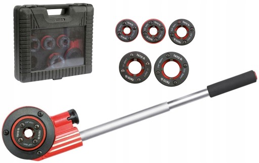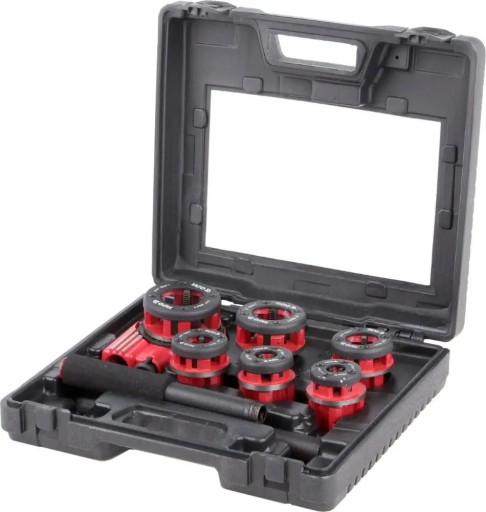 Wysokiej jakości zestaw do gwintowania rur. W skład zestawu wchodzi gwintownica ręczna z systemem grzechotkowym znacznie ułatwiającym pracę oraz przełącznik kierunku pracy. W skład zestawu wchodzi 6 głowic wymiennych o rozmiarach 1/4" (6,3mm), 3/8" (10mm), 1/2" (12,5mm), 3/4" (19mm), 1" (25mm), 5/4" (32mm). Głowice wykonane są z bardzo trwałego i mocnego materiału 9Cr2. Zestaw zapakowany jest w plastikową walizkę wygodną w przenoszeniu oraz przechowywaniu wszystkich elementów.