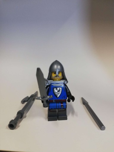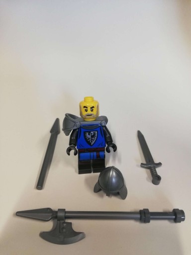 - Zawiera cztery minifigurki: kowala, łucznika oraz dwóch rycerzy herbu Czarny Sokół z czterema mieczami, trzema tarczami i halabardą. Jest tam także ruchoma figurka konia oraz wóz do zbudowania, pies i żaba rzekotka.