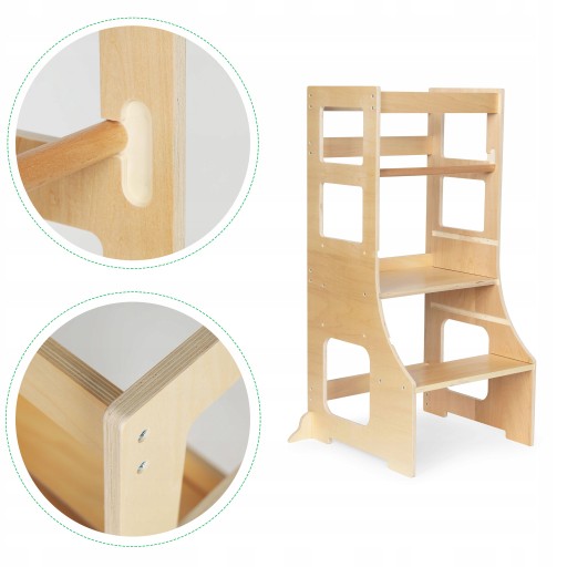 Konstrukcja została wykonana z odpowiednio grubej sklejki, co gwarantuje bezpieczeństwo i żywotność, dzięki temu pomocnik zostanie z Wami na dłużej. Dzięki zastosowaniu sklejki w naturalnym kolorze, pomocnik nabiera wyjątkowego, estetycznego wyglądu i wpasuje się w każdy rodzaj kuchni.