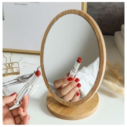 Owalne Lusterko kosmetyczne, stojące Posiada zawias pozwalający na ustalenie kąta lusterka Materiał: - Drewno - Szkło Wymiary: - Wysokość: 21cm - Szerokość lusterka: 16cm - Głębokość podstawy: 12,5 cm Wymiary opakowania: 24 x 17 x 4,5 cm Waga: 370g