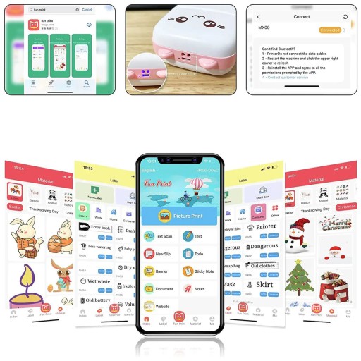 Po sparowaniu z aplikacją, drukarka udostępnia dostęp do bezpłatnej biblioteki zawierającej różnorodne wzory, naklejki, kształty oraz rysunki.