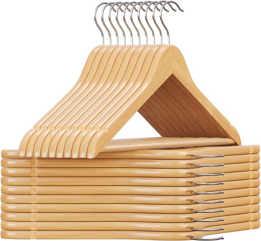 Wieszaki z litego drewna z zachowaną naturalną kolorystyką zostały zaprojektowane z myślą o uporządkowaniu w szafie płaszczy, kurtek, spodni w efektywny i wygodny sposób, a każdy wieszak utrzyma obciążenie do 5 kg. Chromowane srebrne haczyki mają możliwość obrotu o 360 °, które przydadzą się do różnych sytuacji w pomieszczeniu. Sprecyzowane wycięcia w okolicy ramion i antypoślizgowy drążek do spodni zagwarantuje, że powieszona odzież zostanie na miejscu. Prosty i minimalistyczny design pasuje do różnych rodzajów wnętrz i aranżacji, dzięki temu każda szafa czy garderoba nabiorą funkcjonalności, ale również stylu i klasy.
