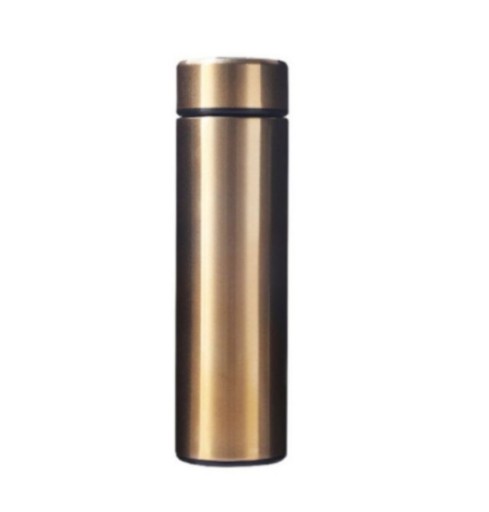 Elegancki kubek termiczny z wyświetlaczem LED pokazującym temperaturę. Posiada praktyczny separator oddzielający fusy. Utrzymuje temperaturę napoju do kilku godzin. Posiada niewymienną baterię CRS2032. Pojemność: 500ml. Kolor: złoty. Wymiary: 22×6,5cm.