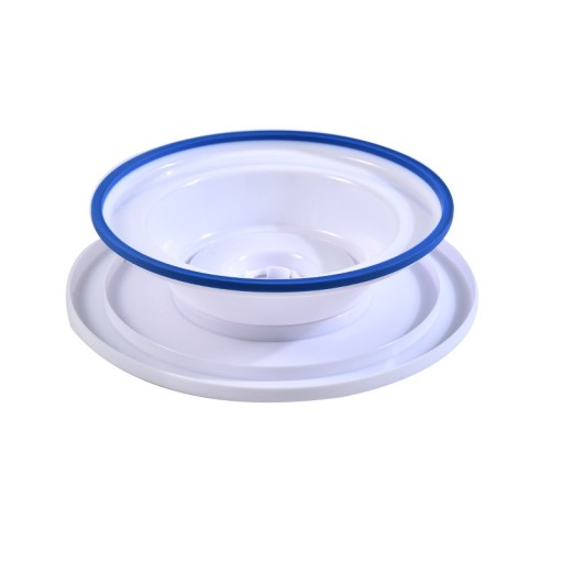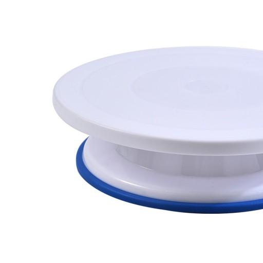 Talerz obrotowy do dekorowania tortów, dzięki mechanizmowi wyposażonemu w kule łożyskowe bardzo lekko się obraca, podstawa antypoślizgowa zapobiega przesuwaniu się talerza po blacie roboczym.