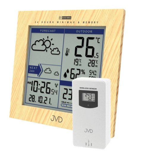 Czytelna stacja pogody JVD RB9233.1. Prognoza pogody - 5 ikon. Termometr, higrometr. Alarmy temperatur. Pamięć temperatury i wilgotności. Wskaźnik komfortu. Budzik. Zegar sterowany radiowo. Obudowa imitująca drewno