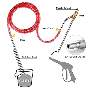 Zestawy do piaskowania: Nasze zestawy do piaskowania za pomocą myjki ciśnieniowej obejmują wąż o długości 3 m, rurkę myjki ciśnieniowej 16 cali (wlot wody), rurkę piasku 15 3/4” (wlot piasku), gogle, 4 opaski zaciskowe, 4 dysze ceramiczne i 2 gumki.