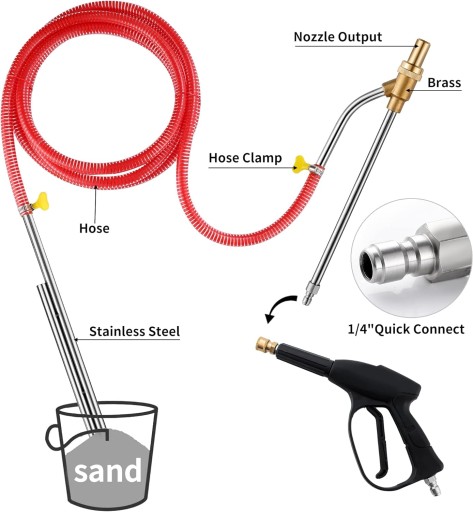 Jak to działa: Zestawy do piaskowania ciśnieniowego służą do wstrzykiwania piasku do układu wodnego w celu oczyszczenia. Aby uzyskać lepsze rezultaty, użyj suchego piasku krzemionkowego, sody oczyszczonej lub umytego piasku rzecznego.