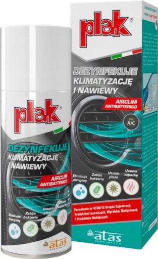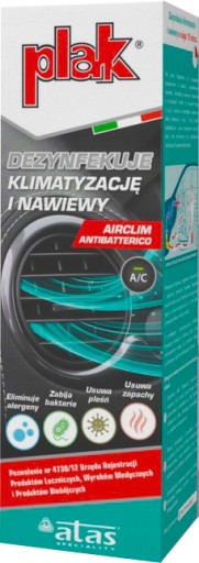 Plak Airclim Antibatterico jest preparatem przeznaczonym do bakterio- i grzybobójczej dezynfekcji klimatyzacji, nawiewów i powietrza w samochodach.