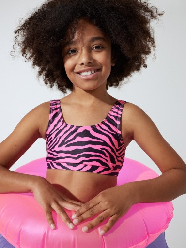 Kostium kąpielowy dwuczęściowy z materiałów z recyklingu dziewczęcy. Uszyliśmy go z elastycznej dzianiny, która dopasuje się do ciała. Szybkoschnący materiał oraz podszewka zapewnią wygodę podczas wodnych aktywności.