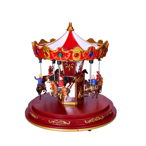 Dekoracyjna figurka karuzeli w świątecznych barwach. Po włączeniu karuzela obraca się, co tworzy piękne widowisko. Karuzela jest bogato zdobiona, dzięki czemu świetnie się prezentuje. Jest to dodatek świąteczny, który doskonale dopełni całości aranżacji. Sprawdzi się również jako upominek dla bliskiej osoby na święta Bożego Narodzenia. Karuzela jest wykonana z trwałego materiału. Dodatkowe oświetlenie led w różnych kolorach dodaje jej uroku.