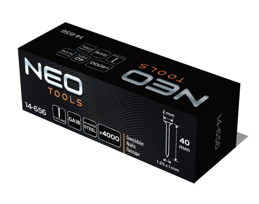 Gwoździe galwanizowane do zszywacza pneumatycznego (14-570), GA18, Typ 300 (F), długość 40 mm, 4000 sztuk 14-656 marki NEO to gwoździe stalowe, galwanizowane, a tym samym odporne na korozję. Przeznaczone są do zszywacza pneumatycznego 14-570 NEO. Charakteryzują się długością 40 mm, typem 300 (F), GA18. Oferowane są w zestawie po 4000 sztuk. Gwoździe polecane do wszelkiego rodzaju prac ze zszywaczami pneumatycznymi. Będą odpowiednie do profesjonalnych zastosowań.