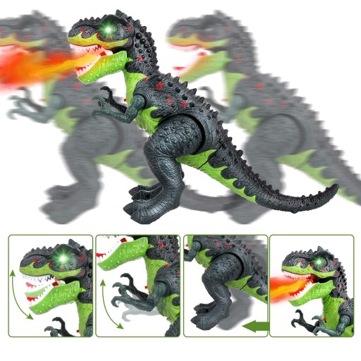 - Funkcja pary - efekt "ziania ogniem" z paszczy dinozaura. Wystarczy za pomocą dołączonej buteleczki nalać wody do pojemnika znajdującego się na głowie i nacisnąć przycisk aktywujący na pilocie. Z paszczy dinozaura wydobywać zacznie się para imitująca ogień, efekt podkręca podświetlony język na czerwono w paszczy.