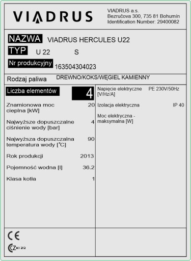 Tabliczka znamionowa zastępcza, wykonana na srebrnej lub białej folii samoprzylepnej dla kotła WIADRUS .