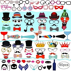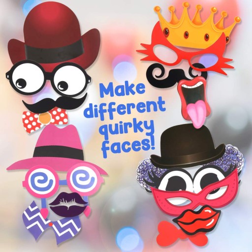 90 sztuk. Akcesoria do zdjęć w stylu mody – ten zestaw do przebierania się zawiera 26 x okulary, 13 x czapki, 14 x kokardka, 18 x broda, 13 x usta, 6 x kieliszek do wina, gwizdek itp. rekwizyty, 90 x pręty i 112 x 3 m kropki samoprzylepne. Możesz przykleić drewniany patyczek do maski, aby cieszyć się majsterkowaniem z bliskimi i przyjaciółmi.