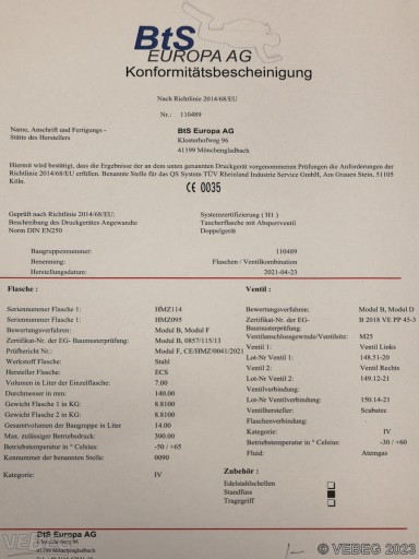 Do każdej butli załączam dokumentację paszportową. Niezbędną do wykonania przeglądu w Polsce. Oczywiście, biorąc pod uwagę stan techniczny butli, nie będzie z nim najmniejszego problemu. Co zostało już sprawdzone, przez poprzednich zadowolonych nabywców.