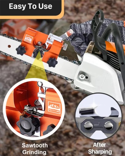 【安装简单】电锯磨刀工具可以在两侧切换,只需将夹具连接到杆上,将淬火插入其中一个导套,也可以切换到另一个衬套,转动手柄只需 3-5 秒即可将钝链条恢复锋利如新。