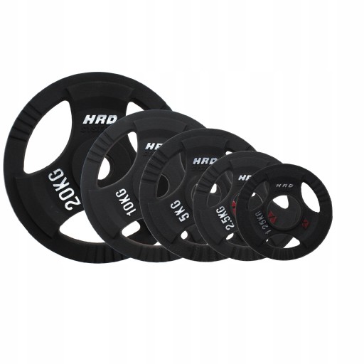 - 4 sztuki obciążenia olimpijskiego żeliwnego z uchwytami o wadze ~2,5kg