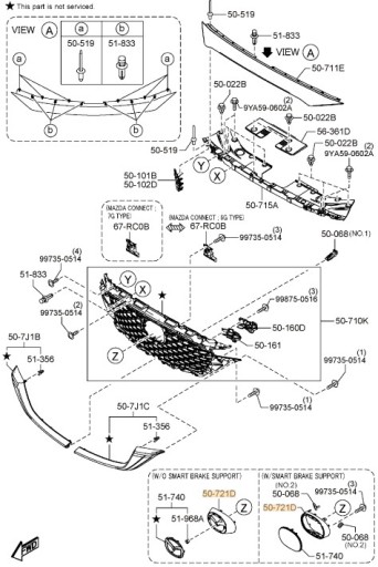 - 1x KSD550721 (Podstawa emblematu atrapy chłodnicy, pozycja numer 50-721D (W/SMART BRAKE SUPPORT) na schemacie)
