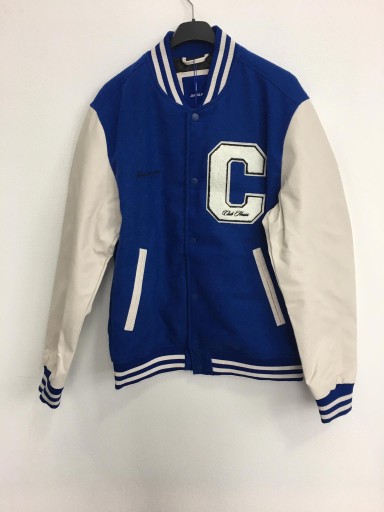 Oferujemy Państwu męską bomberkę marki Jack&Jones.Materiał w kolorze niebieskim, z wyszywaną literą C. Rękawy białe, z materiału imitującego skórę, zakończone ściągaczem. Dwie kieszenie z przodu, jedna we wnętrzu kurtki. Bomberka zapinana na zatrzaski. Kurtka z podszewką.