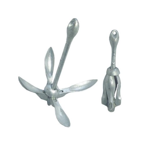 Kotwica składana. Wykonana z odlewu, pokryta ocynkiem. Dzięki niewielkim wymiarom po złożeniu zajmuje niewiele miejsca w bakiście. Świetnie nadaje się jako kotwica główna do małych łodzi wiosłowych i pomocnicza (kierunkowa) do średnich łodzi wędkarskich.