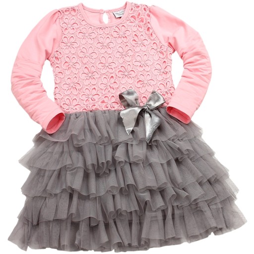 Кружевное платье, тюль с рюшами, РОЗОВЫЙ, СЕРЫЙ, длинные рукава, 110
