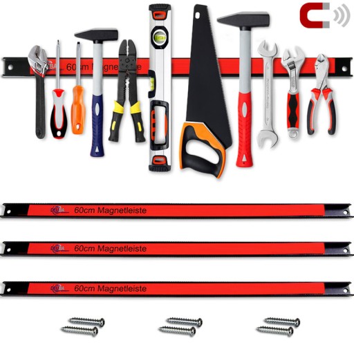 Twoje narzędzia są teraz zawsze pod ręką, ponieważ wszystkie części magnetyczne, takie jak klucze imbusowe, szczypce, śrubokręty, piły i młotki można łatwo przechowywać na magnetycznej listwie. Praktyczne paski magnetyczne o długości 60 cm są idealne dla majsterkowiczów, warsztatów lub kuchni. Każda z listew ma maksymalne obciążenie 23 kg i można ją zamontować na ścianach lub szafkach na dowolnej wysokości. Materiał mocujący jest wliczony w cenę.