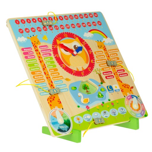Drewniana tablica edukacyjna, kalendarz, zegar