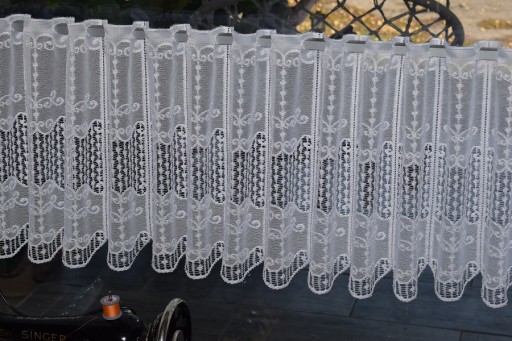 Oferujemy Państwu firankę żakardową, w kolorze białym jako ozdoba kuchni. ZAZDROSTKA KUCHENNA, którą można bez problemu wsunąć na karnisz.