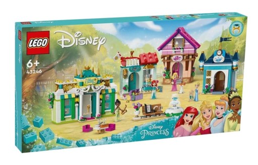 Mnóstwo możliwości zabawy - w zestawie są cztery budynki, mniejsza strefa z doniczką, ławką i fontanną, a także minilaleczki LEGO Disney Princess Arielki, Aurory, Kopciuszka i Tiany.
