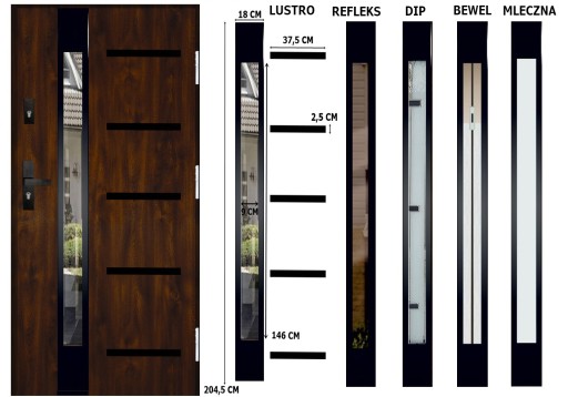 MODEL DRZWI INOX 4ZD5 BLACK KOLOR ORZECH SZYBA LUSTRO, REFLEKS, DIP, BEWEL, MLECZNA+WYMIARY PRZESZKLENIA I ZDOBIEŃ :