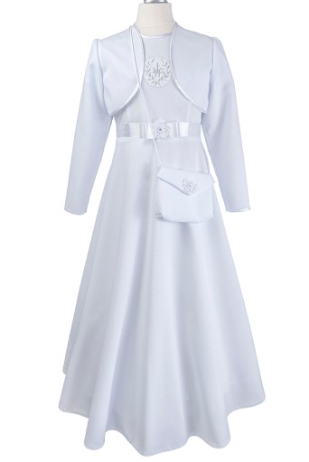 Sukienka uszyta jest ze śnieżnobiałej tkaniny komunijnej gabardyna-strecz , zdobiona kokardką z satynowej tasiemki i kwiatkiem .