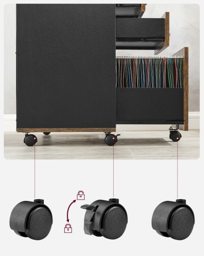 Kontener na kółkach z 3 szufladami i 2 przegrodami z możliwością regulowania półki, wykonany z solidnej płyty MDF w kolorze rustykalnego brązu