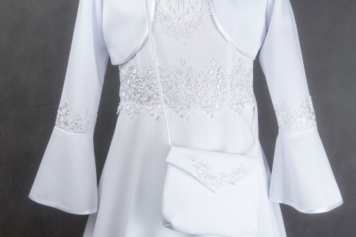 Sukienka uszyta jest ze śnieżnobiałej tkaniny komunijnej gabardyna-strecz , zdobiona delikatną gipiurową koronką .