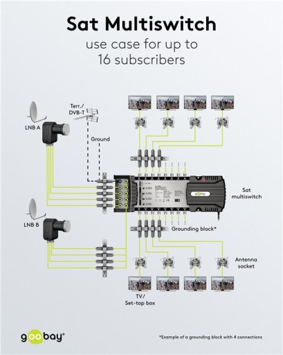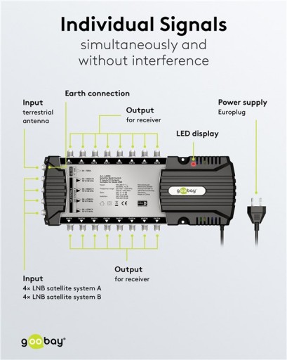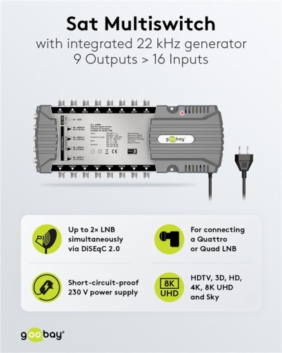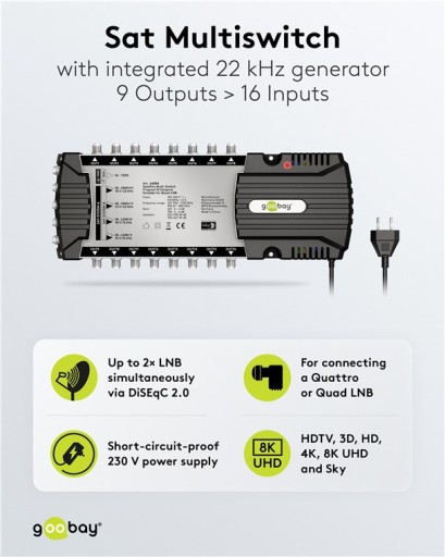 Multiswitch jest wygodnym rozwiązaniem umożliwiającym podłączenie kilku urządzeń do odbioru telewizji i radia w tym samym domu do jednej anteny satelitarnej. Przełącznik zapewnia, że każdy z 16 uczestników może cieszyć się indywidualnym programem - dla maksymalnej elastyczności odbioru telewizji.