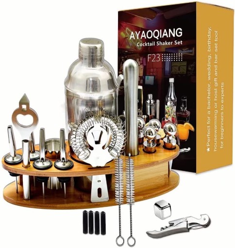 AYAOQIANG Cocktail Making Set Cocktail Shaker Set 750ml Stainless Steel Bar Tool Set Bartender Kit with Display Stand to zestaw barmański, który zapewni Ci wszystko, czego potrzebujesz do przygotowania doskonałych koktajli. Wykonany ze stali nierdzewnej o pojemności 750 ml, shaker zapewnia trwałość i niezawodność. Ten kompletny zestaw zawiera również narzędzia barmańskie, takie jak miarka, muddler, sitko i wiele innych, abyś mógł tworzyć różnorodne i smakowite drinki. Wygodny stojak na zestaw pozwoli Ci zachować porządek i mieć wszystko pod ręką. AYAOQIANG Cocktail Making Set to idealny wybór dla każdego pasjonata barmaństwa.