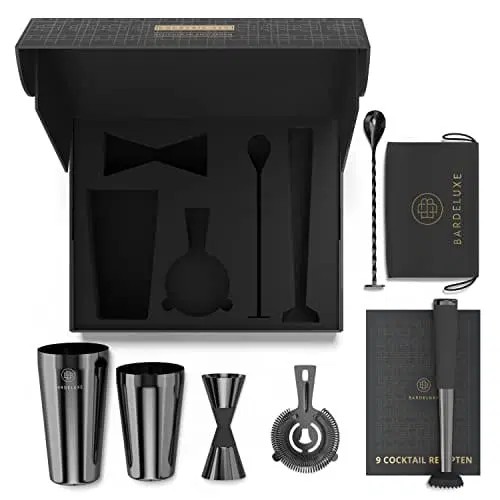 BarDeluxe Boston Shaker 5-częściowy zestaw barmanów - luksusowy zestaw do koktajli z shakerem 750 ml, akcesoriami ze stali nierdzewnej, torbą i książką z przepisami (czarny)
