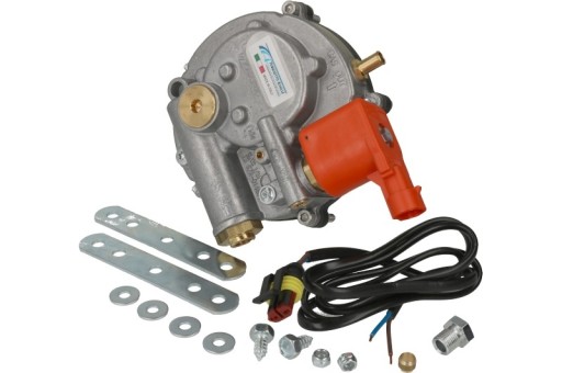 W komplecie: Reduktor AT10 moto z zintegrowanym filtrem (E8-67R-01 4684) średnica króćca wyjścia gazu 7 milimetrów - 1 szt., Płaskownik do mocowania (10 cm x 1,5 cm, pieć otworów pod śrubę M6) - 1 szt., Podkładka szerokokołnierzowa (M5) - 2 szt., Nakrętka (M5) - 2 szt., Blachowkręt pod klucz "10" - 2 szt., Śruba uszczelniająca do przewodu Cu fi6 - 1 szt., Baryłka Cu fi6 - 1 szt.