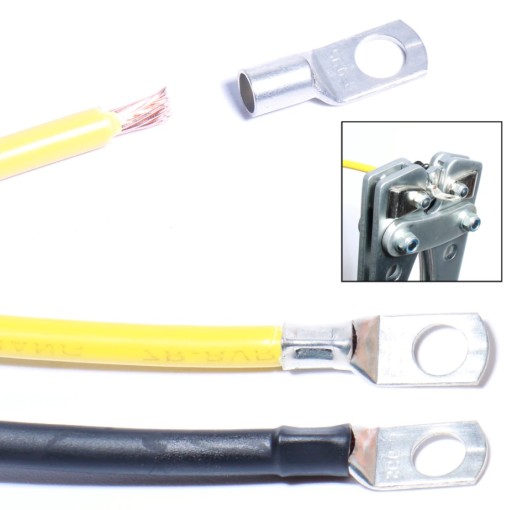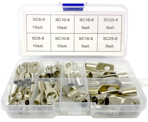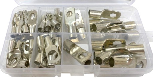 Zestaw końcówek oczkowych przeznaczonych do zaciskania na przewodach wielodrutowych gwarantują trwałe i solidne połączenie.