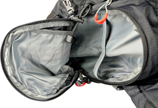 - głęboka komora główna zapinana na zamek z podwójnym suwakiem, dodatkowo jedna przegródka z materiału
