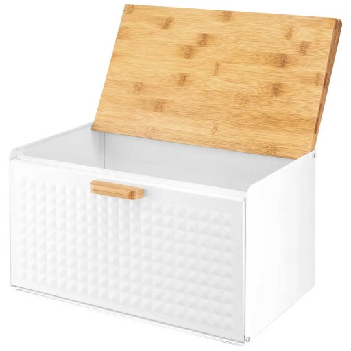 Praktyczny i duży chlebak z bambusową pokrywą, pozwalający na przechowywanie dużej ilości pieczywa, które zachowa świeżość na dłużej. Minimalistyczny oraz klasyczny skandynawski styl z ciekawym tłoczeniem nadają chlebakowi designerskiego charakteru. Uniwersalne połączenie drewna i kremowej bieli sprawia, że będzie pasował do każdej kuchni. Chlebak można otworzyć na dwa sposoby, posiada on możliwość otwarcia pokrywy przedniej lub górnej, ewentualnie obu jednocześnie, co zdecydowanie ułatwia to wyjmowanie pieczywa.